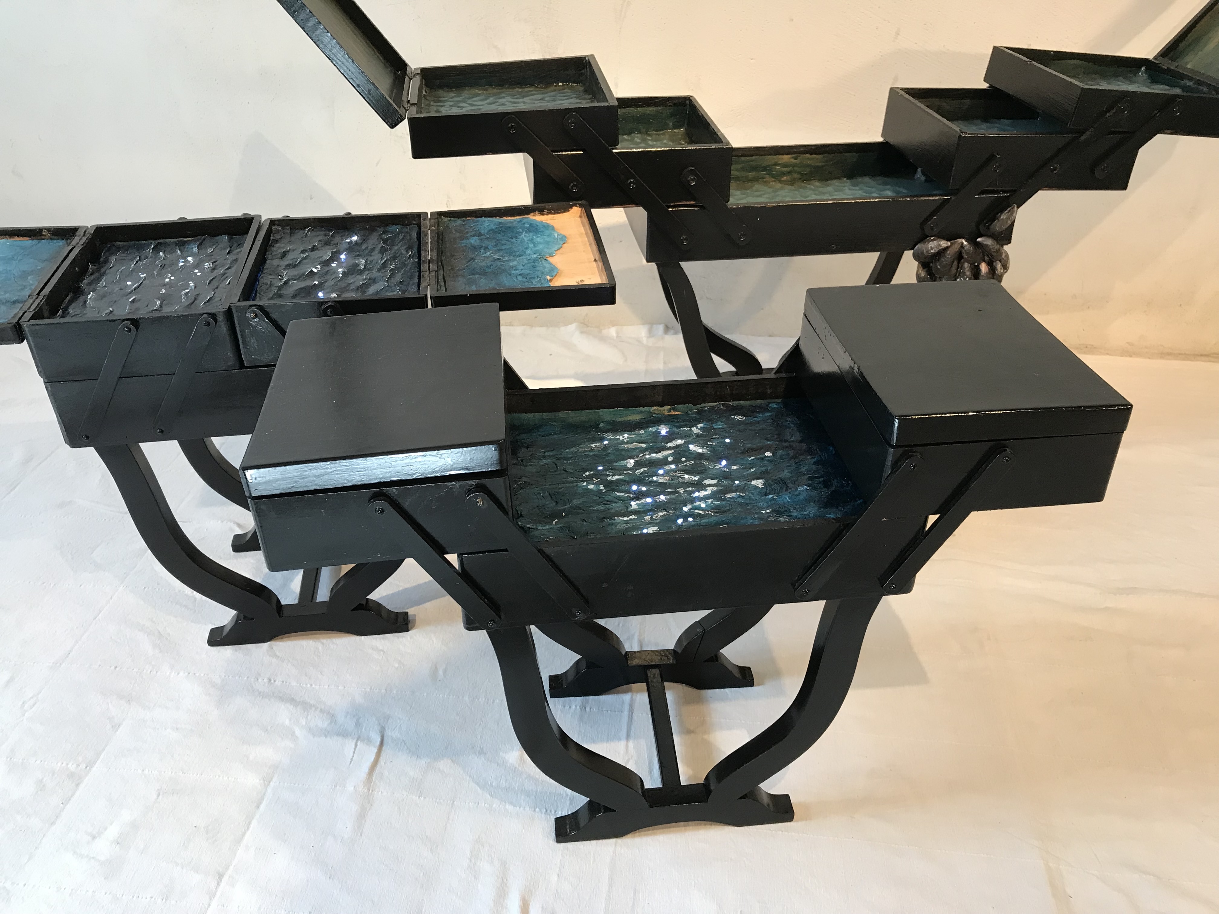 À partir de ce petit meuble utilisé pour les couturières d'autrefois, le projet pour le collectif "Les Travailleuses" fut de trouver un symbole liant féminité et travail, mais qui ne soit pas forcément humain. La Lune justifie ainsi sa présence, symbole féminin dans de nombreuses cultures, dont le travail sur la mer est le plus visible et universel. L’autre intention fut d’utiliser l’objet à contre-emploi : au lieu de remplir les cases de différentes choses, tenter de les unifier par quelque chose de non divisible. Utiliser l'eau de mer et la sculpter fut impératif pour de multiples raisons. La mer devient alors un matériau modulable et entrant dans des cases sous l’influence d’une Lune dont les phases, les coefficients de marée, sont exprimés dans les différentes travailleuses. Ces dispositifs tentent tour à tour de manière absurde soit de recréer un mécanisme naturel, soit de rendre organique un objet inanimé.
